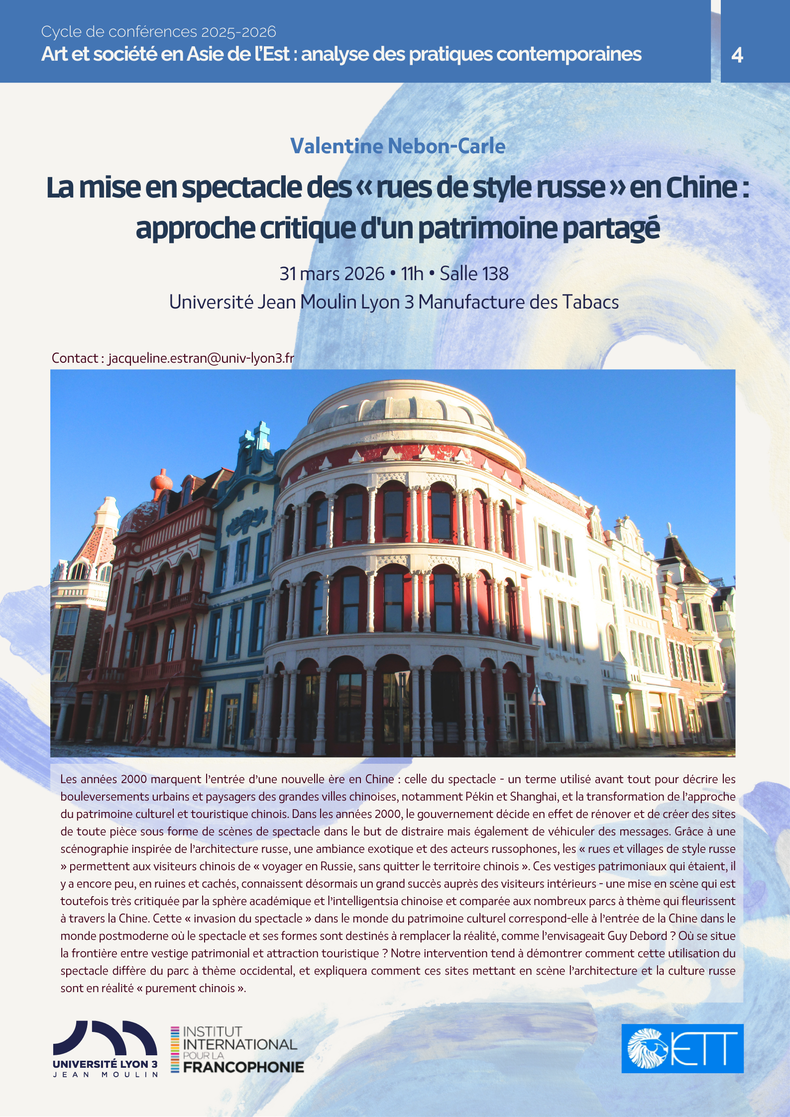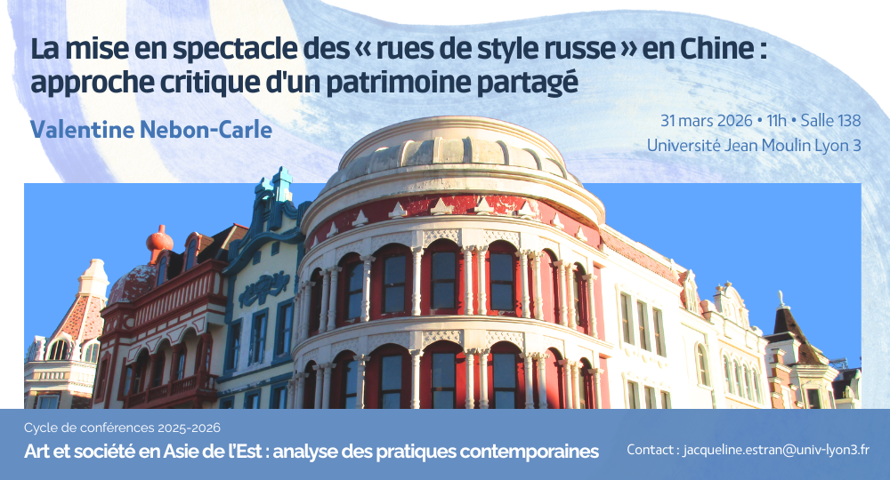 Dans le cadre du cycle de conférences « Art et société en Asie de l’Est : analyse des pratiques contemporaines » (2025-2026), dont l'objectif est de faire découvrir les pratiques artistiques contemporaines en Asie (Chine, Corée, Japon) ainsi que les enjeux sociaux, politiques et culturels qui leur sont liés dans un contexte où l'art et la culture sont de plus en plus mobilisés dans la gestion de questions sociétales, Valentine Nebon-Carle proposera une conférence intitulée « La mise en spectacle des « rues de style russe » en Chine : approche critique d'un patrimoine partagé »