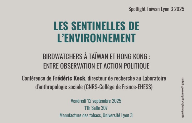 La conférence « Les sentinelles de l’environnement : Birdwatchers à Taïwan et Hong Kong : entre observation et action politique » donnée par Frédéric Keck, directeur de recherche au Laboratoire d'anthropologie sociale (CNRS-Collège de France-EHESS) s'inscrit dans la série d’événements Spotlight 2025, autour du thème général « Écologies de Taïwan ».