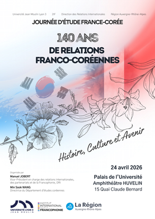 À l’occasion de cet anniversaire, l’Institut International pour la Francophonie - Direction des relations internationales et le Département d'études coréennes de la Faculté des langues de l’Université Jean Moulin Lyon 3 organisent, avec le soutien de la Région Auvergne-Rhône-Alpes, une journée d’étude sur le thème « 140 ans de relations franco-coréennes : histoire, culture, avenir », le 24 avril 2026, en amphithéâtre Huvelin, de 8h30 à 17h30. Celle-ci s’inscrit dans le cadre du French Asian Hub (FAH), la stratégie asiatique de l’Université.