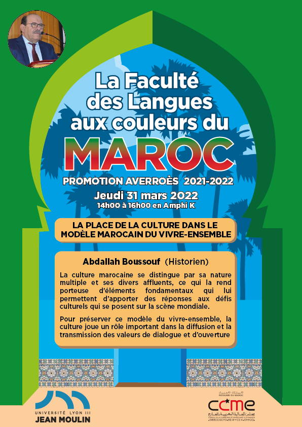 Tout au long de l'année universitaire 2021-2022, la Faculté des Langues de l’Université Jean Moulin Lyon 3 portera les couleurs du Maroc.