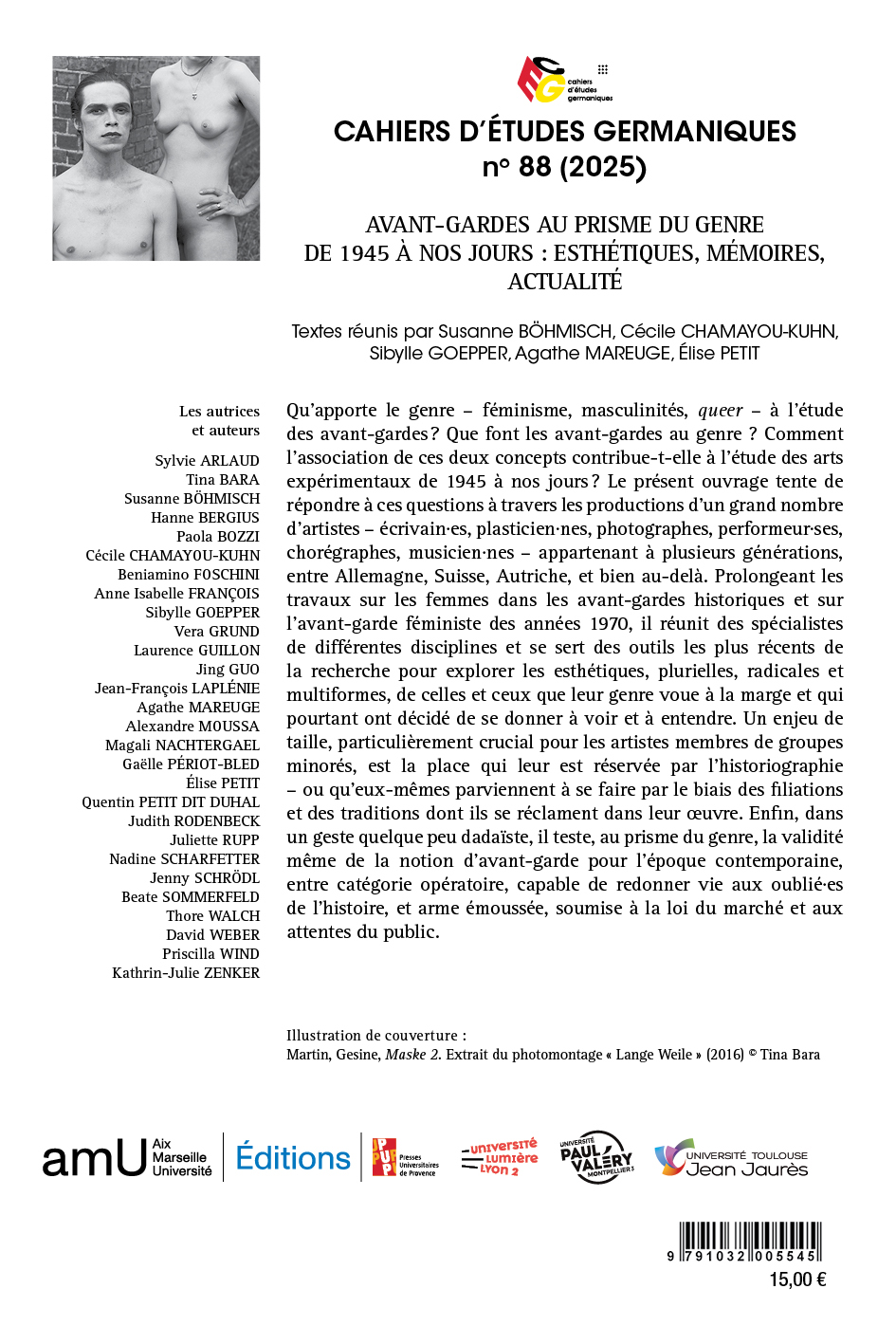 Qu'apporte le genre - féminisme, masculinités, queer - à l'étude des avant-gardes? Que font les avant-gardes au genre ? Comment l'association de ces deux concepts contribue-t-elle à l'étude des arts expérimentaux de 1945 à nos jours? Le présent ouvrage tente de répondre à ces questions à travers les productions d'un grand nombre d'artistes - écrivain es, plasticien-nes, photographes, performeur-ses, chorégraphes, musicien-nes - appartenant à plusieurs générations, entre Allemagne, Suisse, Autriche, et bien au-delà. Prolongeant les travaux sur les femmes dans les avant-gardes historiques et sur l'avant-garde féministe des années 1970, il réunit des spécialistes de différentes disciplines et se sert des outils les plus récents de la recherche pour explorer les esthétiques, plurielles, radicales et multiformes, de celles et ceux que leur genre voue à la marge et qui pourtant ont décidé de se donner à voir et à entendre. Un enjeu de taille, particulièrement crucial pour les artistes membres de groupes minorés, est la place qui leur est réservée par l'historiographie